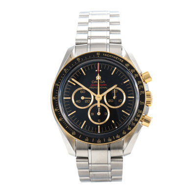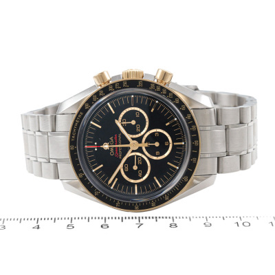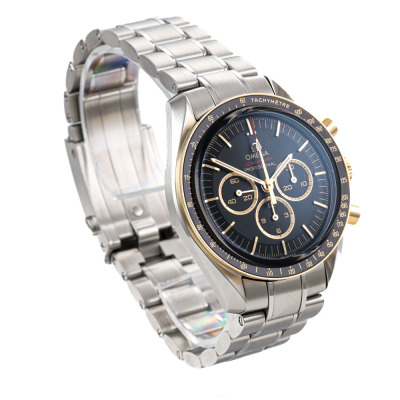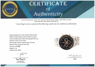 Omega Speedmaster Tokyo Olympic 2020 Limited Edition of 2020 stainless steel and 18ct rose gold manual winding mens watch. Black chronograph dial, case diameter: 42mm, wrist size: 20cm, Swiss made. Ref# 522.20.42.30.01.001. With Omega stainless steel bracelet and clasp. With Certificate of Authenticity, Omega Certificate of Authenticity and Omega box. 3 month FSA warranty. (Pre-owned)