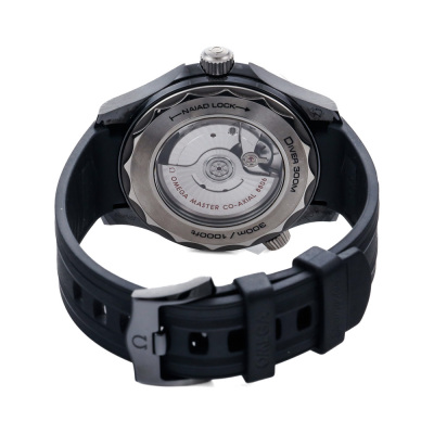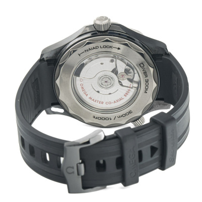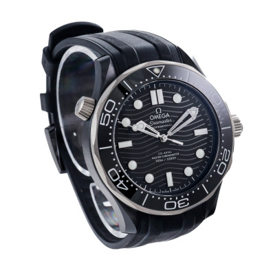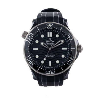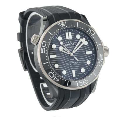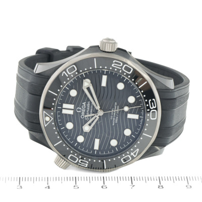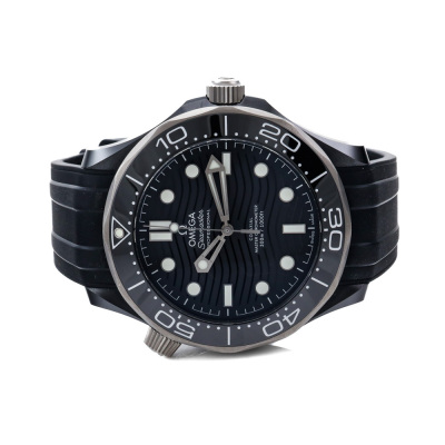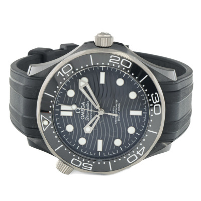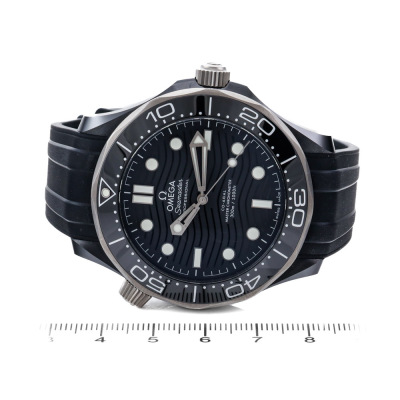 Omega Seamaster Diver black ceramic and titanium automatic mens watch. Black dial, date, case diameter: 43.5mm, maximum wrist size: 21.5cm, Swiss made. Ref #210.92.44.20.01.001. With Omega black rubber strap and buckle. With Certificate of Authenticity. 3 month FSA warranty. (Pre-owned)