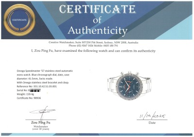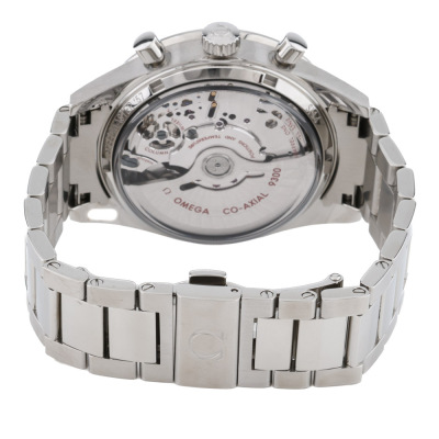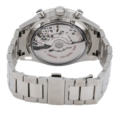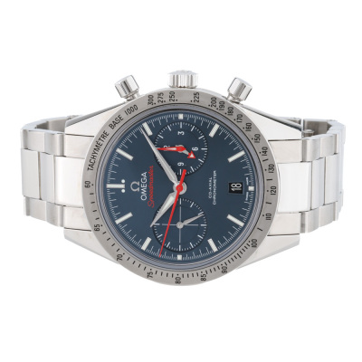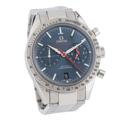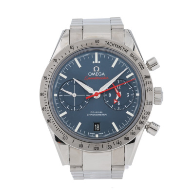 Omega Speedmaster '57 stainless steel automatic mens watch. Blue chronograph dial, date, case diameter: 41.5mm, wrist size: 16.5cm, Swiss made. Ref# 331.10.42.51.03.001. With Omega stainless steel bracelet and clasp. With Certificate of Authenticity. 3 month FSA warranty. Weight: 159.4g (Pre-owned)