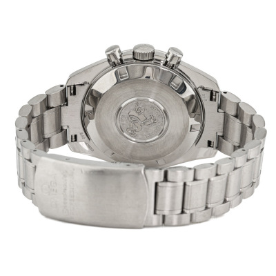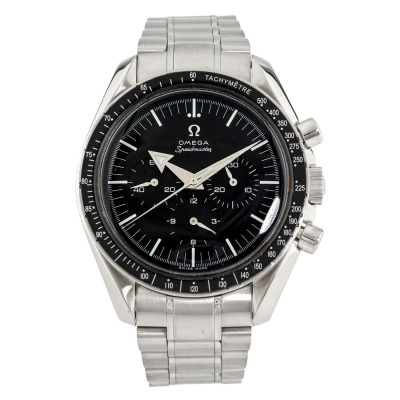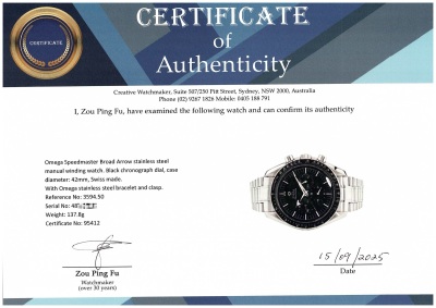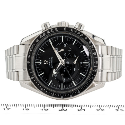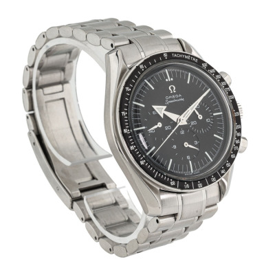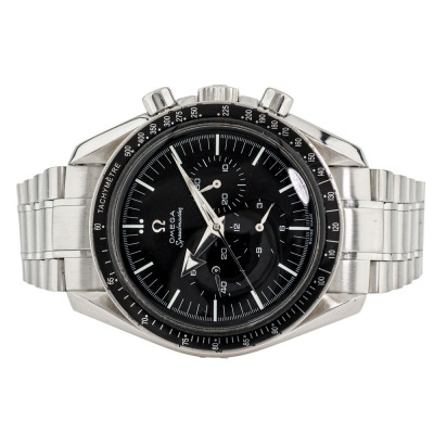 Omega Speedmaster Broad Arrow stainless steel manual winding mens watch. Black chronograph dial, case diameter: 42mm, wrist size: 19.5cm, Swiss made. Ref #3594.50. With Omega stainless steel bracelet and clasp. With Certificate of Authenticity, Omega International Warranty card and Omega box. 3 month FSA warranty. (Pre-owned)
