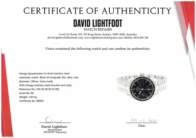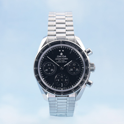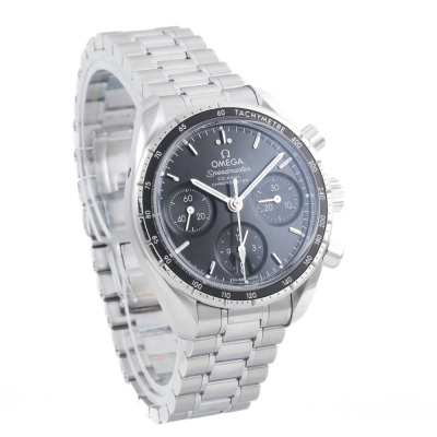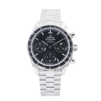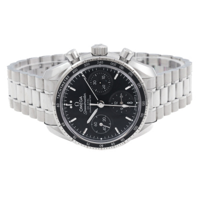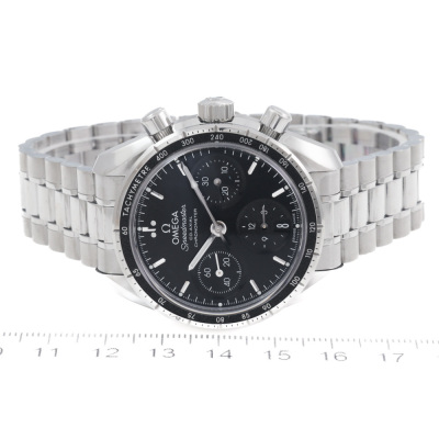 Omega Speedmaster Co-Axial stainless steel automatic mens watch. Black chronograph dial, date, case diameter: 38mm, wrist size: 20cm, Swiss made. Ref# 324.30.38.50.01.001. With Omega stainless steel bracelet and clasp. With Certificate of Authenticity, Undated Omega International Warranty Card, Omega Pictograms card and Omega box. 3 month FSA warranty. (Pre-owned)