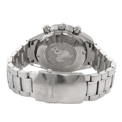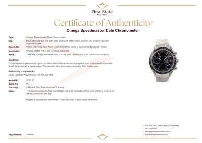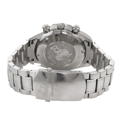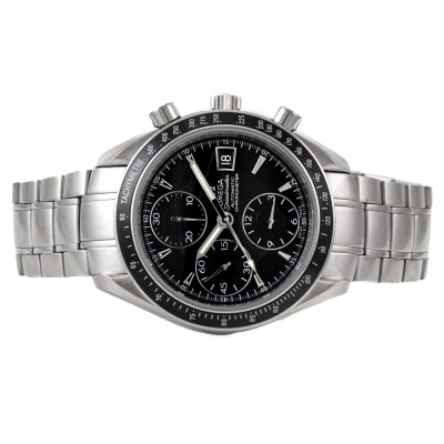 Omega Speedmaster Date stainless steel automatic mens watch. Black chronograph dial, date, case diameter: 40mm, wrist size: 18cm, Swiss made. Ref# 3210.50. Circa: 2000. With Omega stainless steel bracelet and clasp. With Certificate of Authenticity. 3 month FSA warranty. Weight: 158.9g
