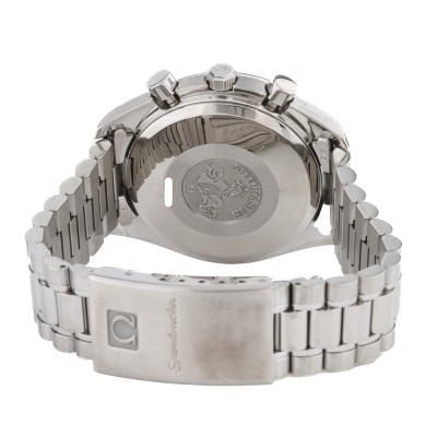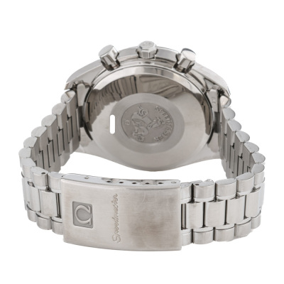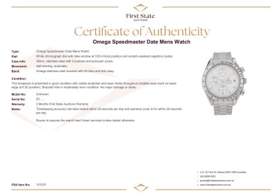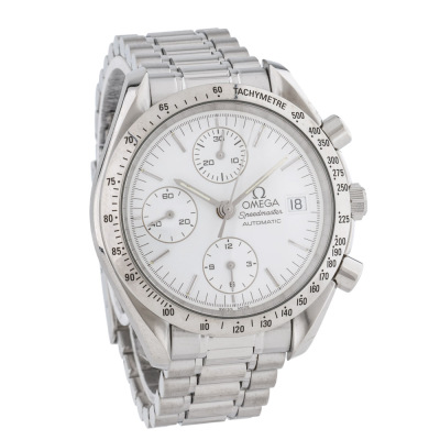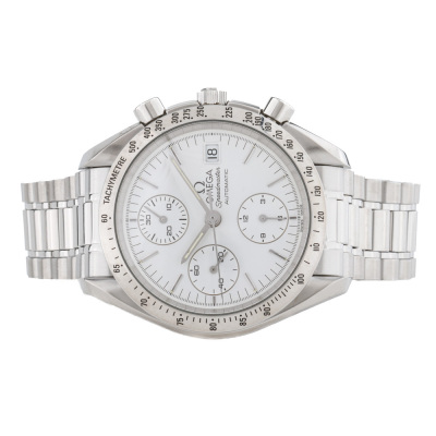 Omega Speedmaster Date stainless steel automatic mens watch. White chronograph dial, date, case diameter: 39mm, wrist size: 16.5cm, Swiss made. Ref# 3511.20. With Omega stainless steel bracelet and clasp. With Omega stainless steel bracelet and clasp. With Certificate of Authenticity. 3 month FSA warranty. 3 month FSA warranty