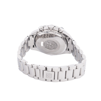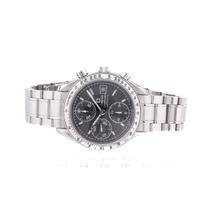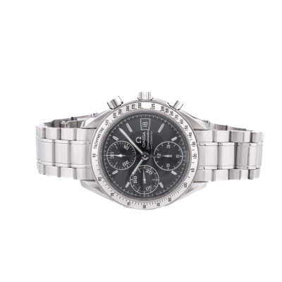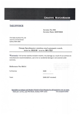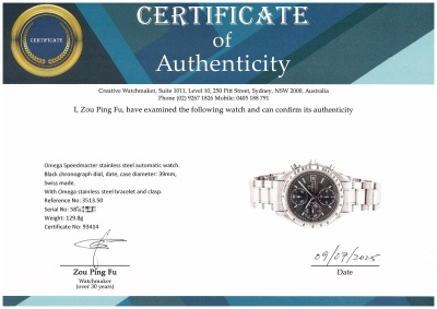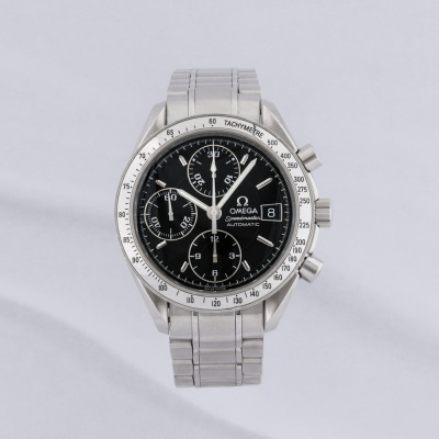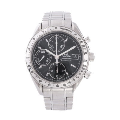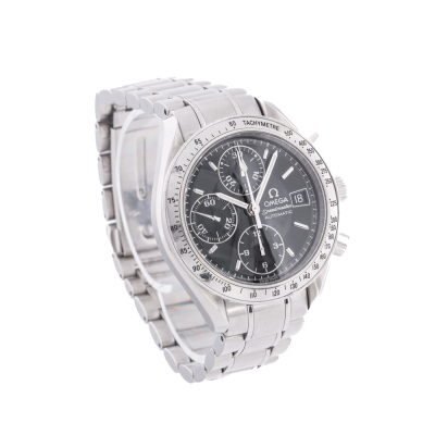 Omega Speedmaster stainless steel automatic mens watch. Black chronograph dial, date, case diameter: 39mm, wrist size: 17.5cm, Swiss made. Ref #3513.50. With Omega stainless steel bracelet and clasp. With Certificate of Authenticity and Creative full service invoice dated 28/07/25. 6 month Creative Watchmaker warranty from the date of full service. Weight: 129.8g