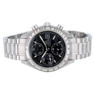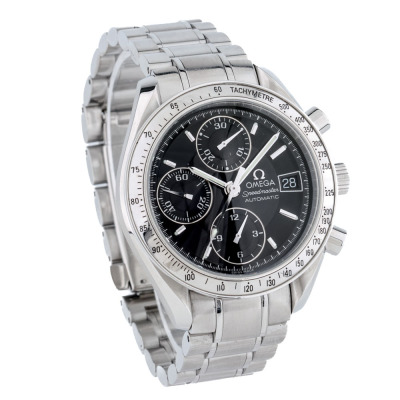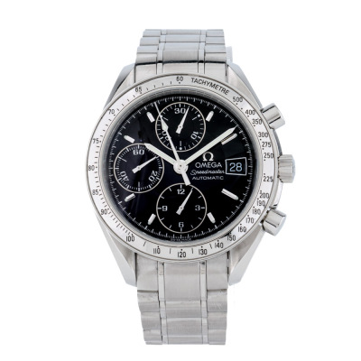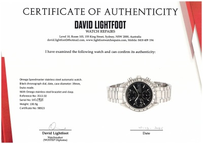 Omega Speedmaster stainless steel automatic mens watch. Black chronograph dial, date, case diameter: 39mm, wrist size: 17.5cm, Swiss made. Ref #3513.50. With Omega stainless steel bracelet and clasp. With Certificate of Authenticity, Omega International Warranty card dated 14/05/2005 and Omega box. 3 month FSA warranty. Weight: 130.9g
