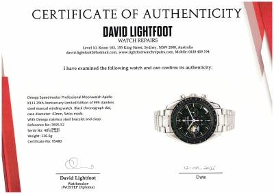 Omega Speedmaster Professional Moonwatch Apollo X111 25th Anniversary Limited Edition of 999 stainless steel manual winding mens watch. Black chronograph dial, case diameter: 42mm, wrist size: 20cm, Swiss made. Ref# 3595.52. With Omega stainless steel bracelet and clasp. With Certificate of Authenticity. 3 month FSA warranty. Weight: 136.6g (Pre-owned)