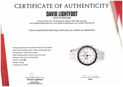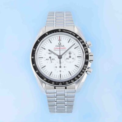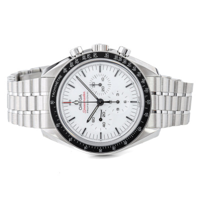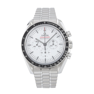 Omega Speedmaster Professional Moonwatch stainless steel manual winding mens watch. White chronograph dial, case diameter: 42mm, wrist size: 20cm, Swiss made. Ref# 310.32.42.50.04.001. With Omega stainless steel bracelet and clasp. With Certificate of Authenticity, Omega International Warranty card dated 18/04/2025, Master Chronometer Certificate card, Pictograms card and Omega box. Balance of 5 year Omega manufacturer warranty applies. (Pre-owned)
