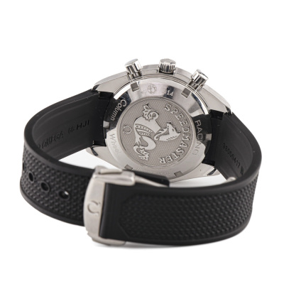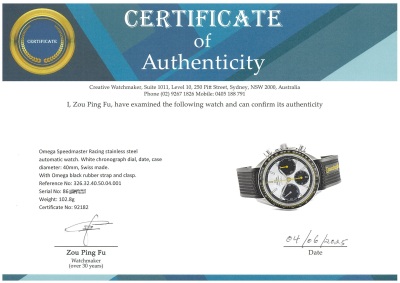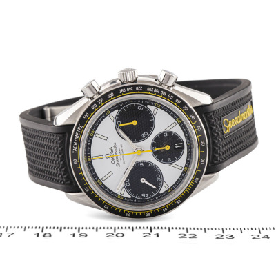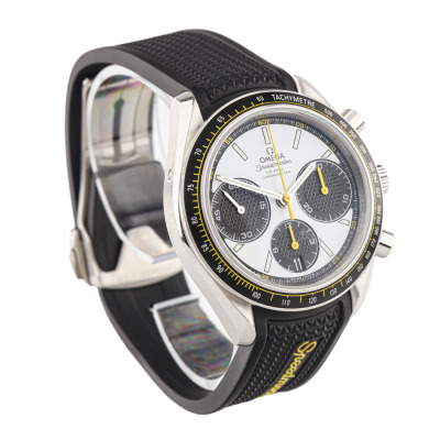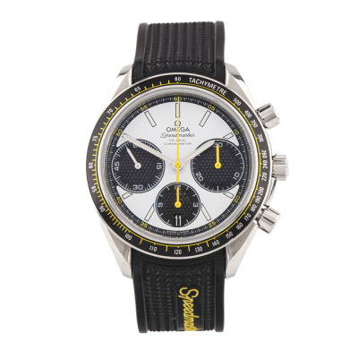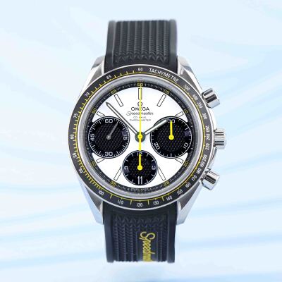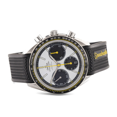 Omega Speedmaster Racing stainless steel automatic mens watch. White chronograph dial, date, case diameter: 40mm, adjustable max wrist size: 19cm, Swiss made. Ref# 326.32.40.50.04.001. With Omega black rubber strap and clasp. With Certificate of Authenticity. 3 month FSA warranty. (Pre-owned)