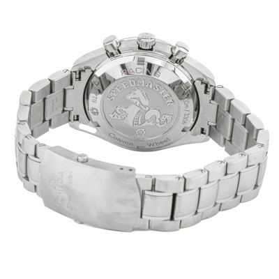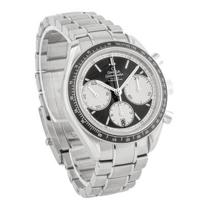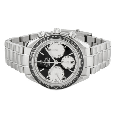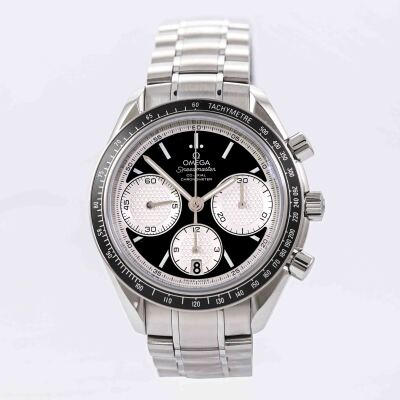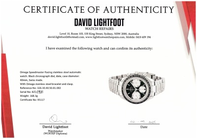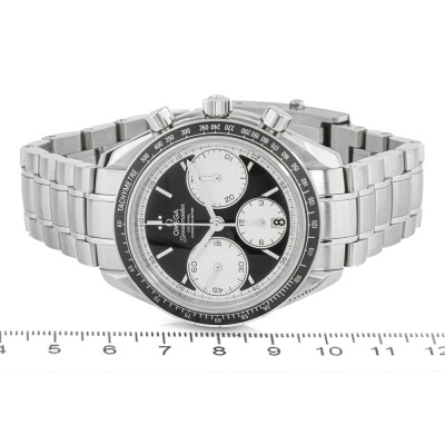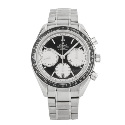Omega Speedmaster Racing stainless steel automatic mens watch. Black chronograph dial, date, case diameter: 40mm, wrist size: 19.5cm, Swiss made. Ref #326.30.40.50.01.002. With Omega stainless steel bracelet and clasp. With Certificate of Authenticity, undated Omega International Warranty card, Pictograms card and Omega box. 3 month FSA warranty (Pre-owned)