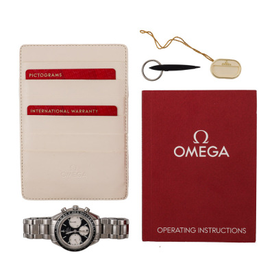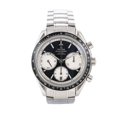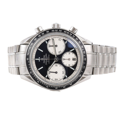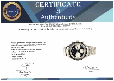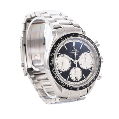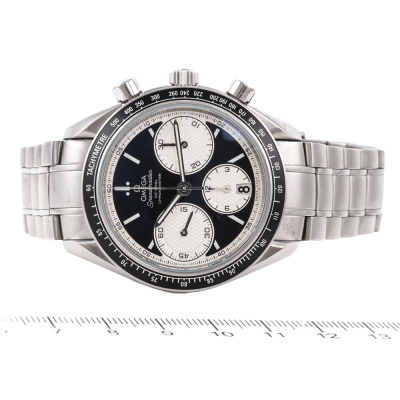 Omega Speedmaster Racing stainless steel automatic mens watch. Black chronograph dial, date, case diameter: 40mm, wrist size: 19.5cm, Swiss made. Ref #326.30.40.50.01.002. With Omega stainless steel bracelet and clasp. With Certificate of Authenticity, undated Omega International Warranty card, Omega Pictograms card and Omega box. 3 month FSA warranty. Weight: 166.4g. (Pre-owned)