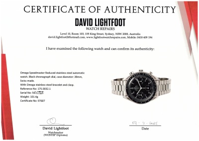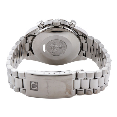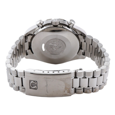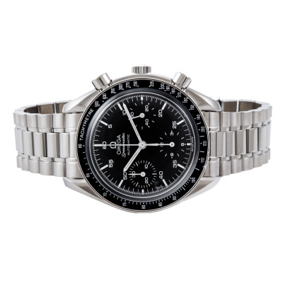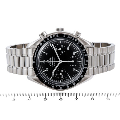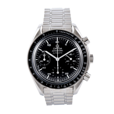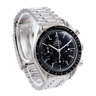 Omega Speedmaster Reduced stainless steel automatic mens watch. Black chronograph dial, case diameter: 39mm, wrist size: 17.5cm, Swiss made. Ref# 175.0032.1, Circa: 1998. With Omega stainless steel bracelet and clasp. With Certificate of Authenticity. 3 month FSA warranty. Weight: 101.4g (Pre-owned)