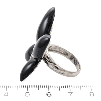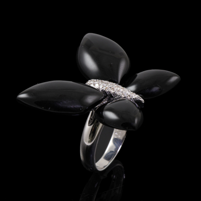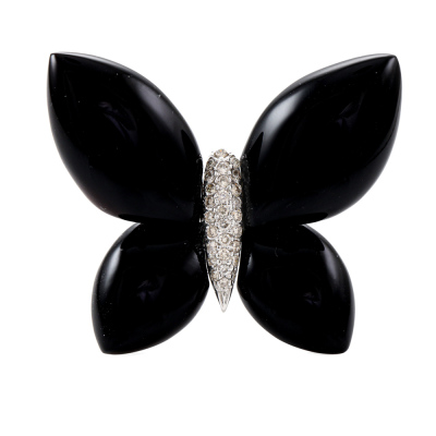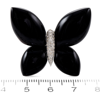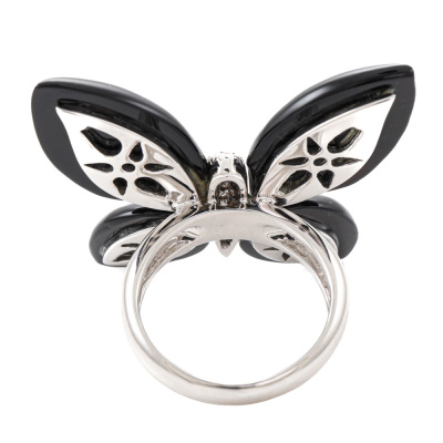 Butterfly design ring with pear shape cabochon cut Natural Onyx of size 2.3 x 1.3cm & 1.7 x 1.2cm and round Natural Diamonds totalling 0.25ct. 18ct white gold. Ring size: N 1/4. Band width: 3.2mm - 4.2mm. Weight: 15.3g. (Pre-owned)