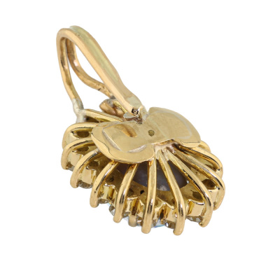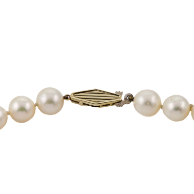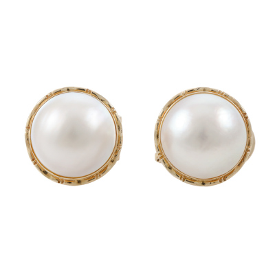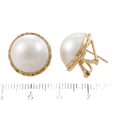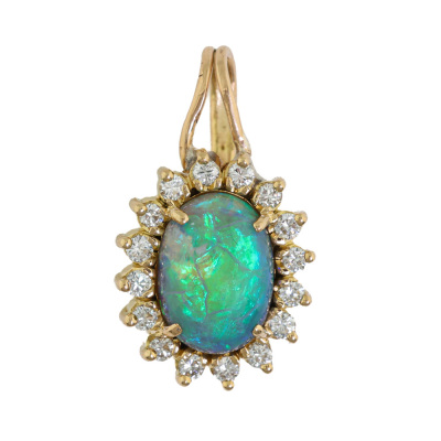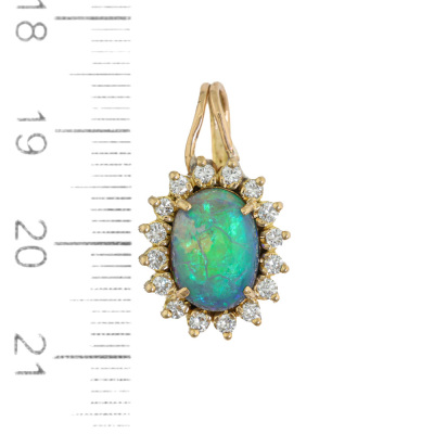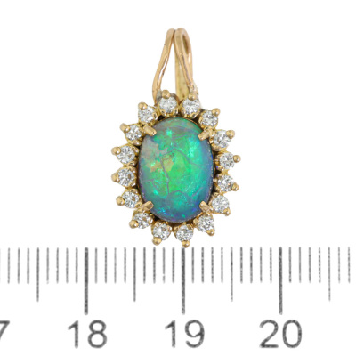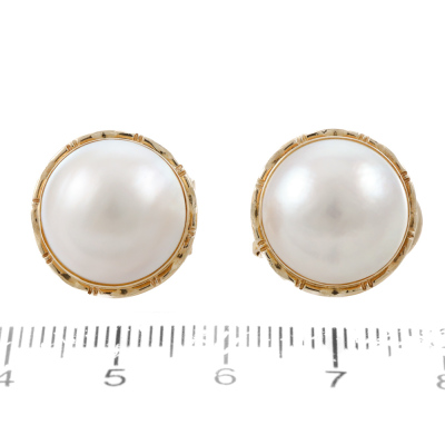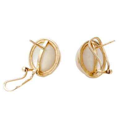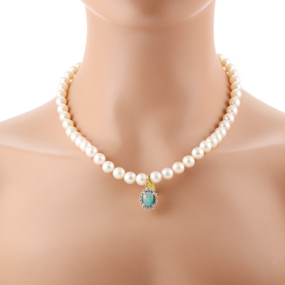 Opal & Akoya Pearl Necklace and Mabe Pearl Earrings set. 1) Necklace with centre Opal enhancer pendant set with oval cabochon cut solid Natural Grey Opal of approximately size 10.7 x 7.5mm, round Natural Diamonds totalling 0.32ct (Estimated grading: G-H SI). Pearl necklace with 50 Akoya pearls from 8.3mm - 8mm. 18ct yellow gold pendant and 14ct yellow gold necklace clasp. Length: 46cm. 2) Clip-on earrings (for pierced ears) with Mabe Pearls of 14.2mm. 14ct yellow gold. Total weight: 51.8g.
