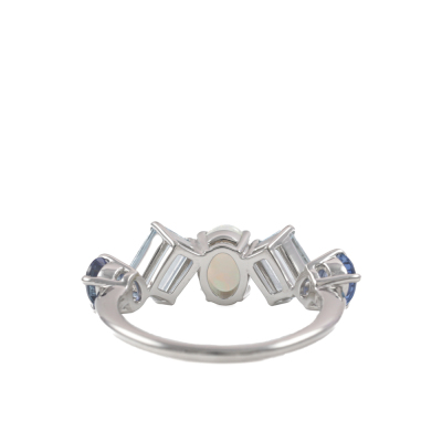 Opal, Aquamarine, Sapphire & Topaz ring with centre cabochon cut Natural Opal of 0.50ct, emerald cut Natural Aquamarine of 0.52ct, 2 oval shape Natural Blue Sapphire totalling 0.88ct and emerald cut Natural light blue Topaz of 0.61ct. Platinum - 900. Ring size M½. Band width: 1.5mm - 1.7mm. Weight: 4.7g. (Pre-owned)