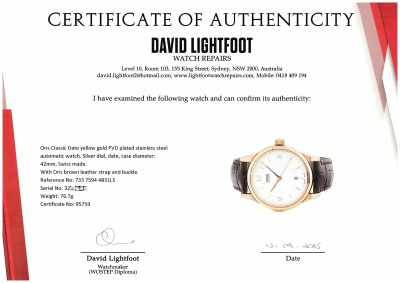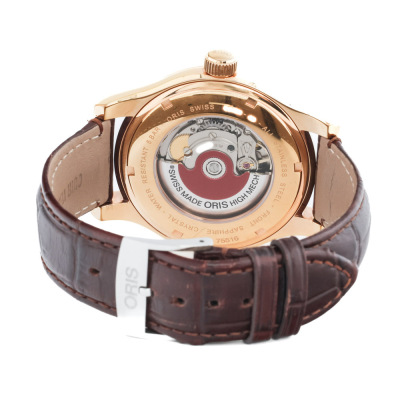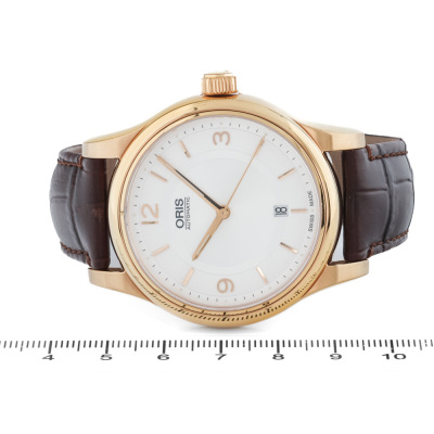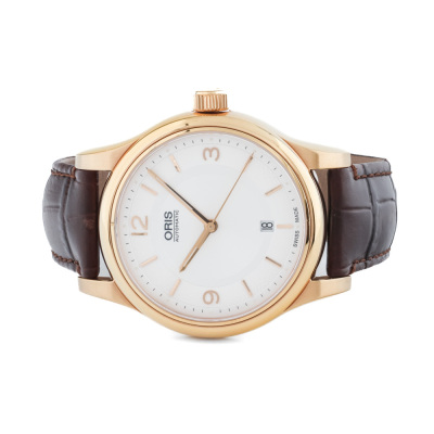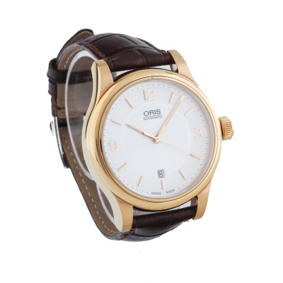 Oris Classic Date yellow gold PVD plated stainless steel automatic mens watch. Silver dial, date, case diameter: 42mm, max wrist size: 19.5, Swiss made. Ref# 733 7594 4831LS. With Oris brown leather strap and buckle. With Certificate of Authenticity. No box provided. No warranty applies. (Pre-owned)