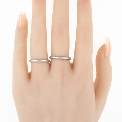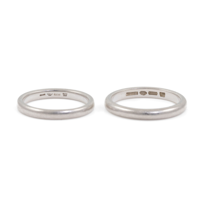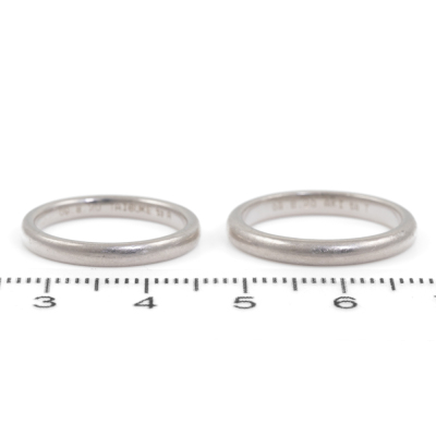 Pair Bvlgari wedding bands. Platinum 950. Ring size M & J1/2, - ring resizing is not recommended. Band width: 2.7mm & 2.5mm. Made In Italy. Weight: 4.9g, 3.9g. Total Weight: 8.8g. With engraving: '09.8.20 AKI to T' & '09.8.20 TAISUKE to A' (Pre-owned)