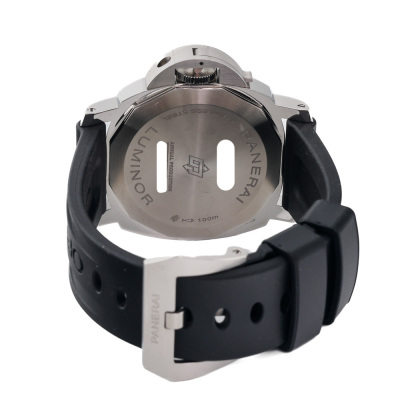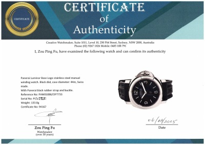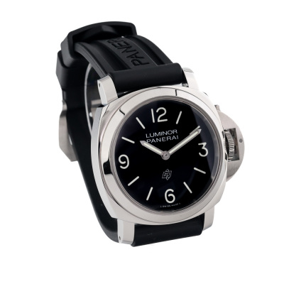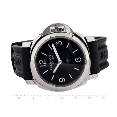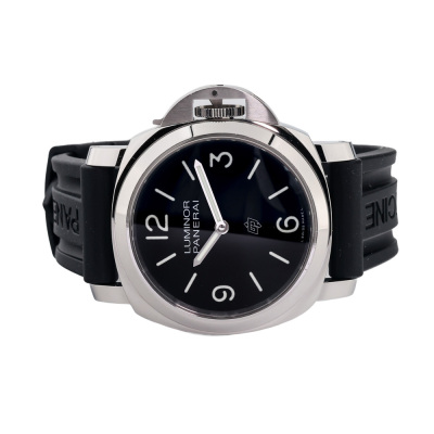 Panerai Luminor Base Logo stainless steel manual winding mens watch. Black dial, case diameter: 44m, strap length: 21.5cm, Swiss made. Ref# PAM01086/OP7733. With Panerai black rubber strap and buckle. With Certificate of Authenticity. 3 month FSA warranty. (Pre-owned)