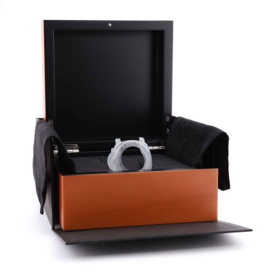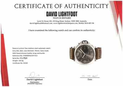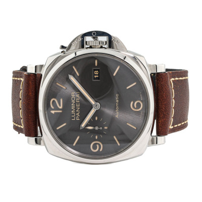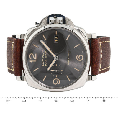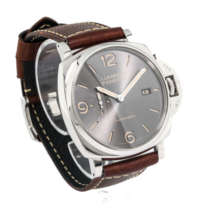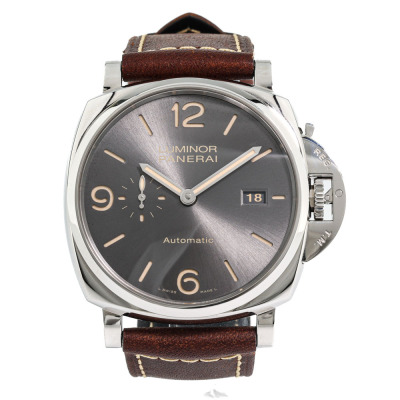 Panerai Luminor Due stainless steel automatic mens watch. Grey dial, date, case diameter: 45mm, strap length: 21.5cm, Swiss made. Ref# PAM00943/OP7153. With Panerai brown leather strap and buckle. With Certificate of Authenticity, undated Panerai International Limited Warranty card and Panerai box. 3 month FSA warranty (Pre-owned)
