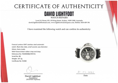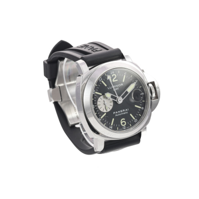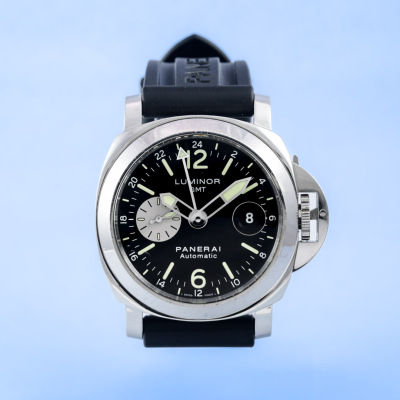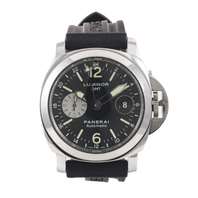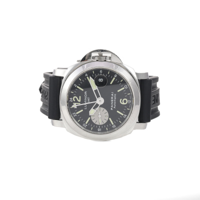 Panerai Luminor GMT stainless steel automatic mens watch. Black dial, date, small second, case diameter: 44mm, adjustable wrist size: 19cm, Swiss made. Ref# PAM00088/OP6761. With Panerai black rubber strap and clasp. With Certificate of Authenticity, Panerai International Guarantee Certificate dated 02/11/2010 and Panerai box. 3 month FSA warranty. (Pre-owned).