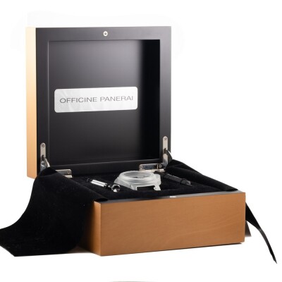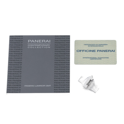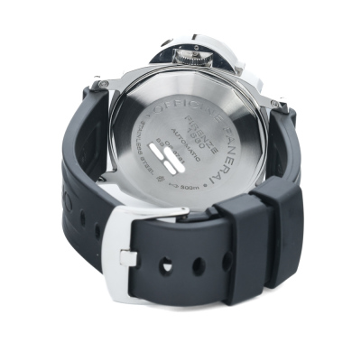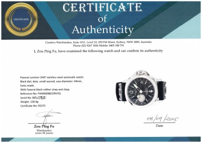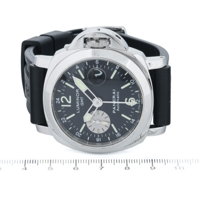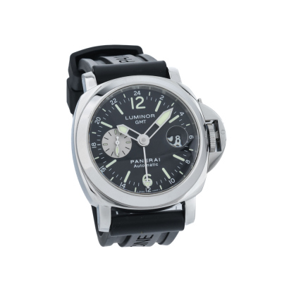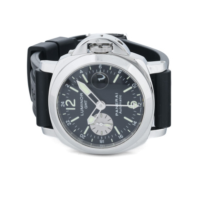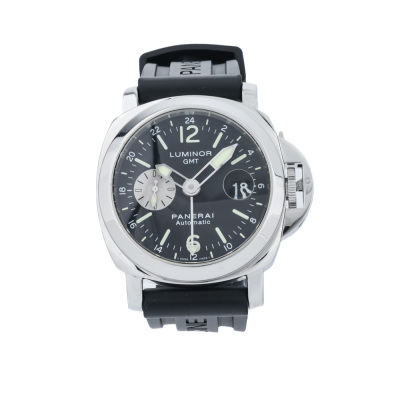 Panerai Luminor GMT stainless steel automatic mens watch. Black dial, date, small second, case diameter: 44mm, max wrist size: 20.5cm, Swiss made. Ref# PAM00088/OP6761. With Panerai black rubber strap and clasp. With Certificate of Authenticity, Panerai International Guarantee card dated 16/07/2008, spare Panerai clasp and Panerai box. 3 month FSA warranty. (Pre-owned).