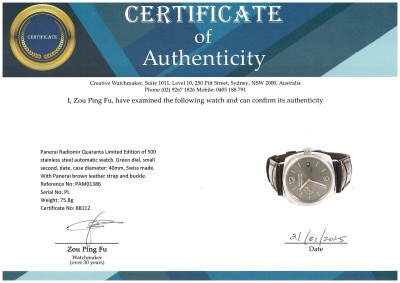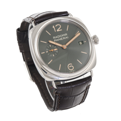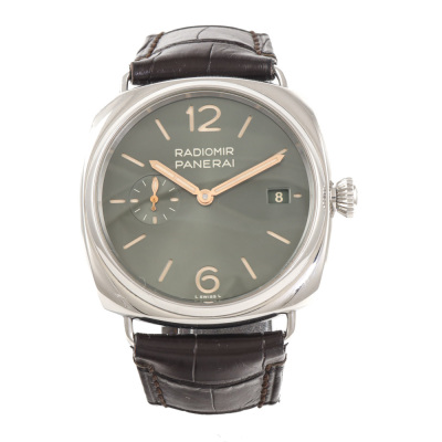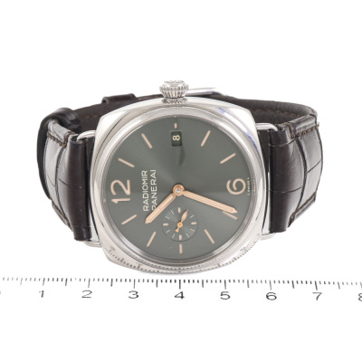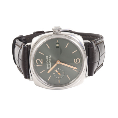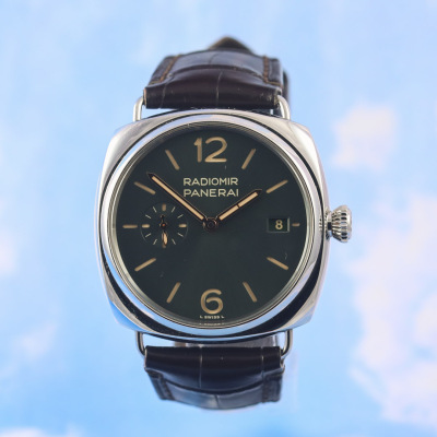 Panerai Radiomir Quaranta Limited Edition of 500 stainless steel automatic mens watch. Green dial, small second, date, case diameter: 40mm, strap length: 20.5cm, Swiss made. Ref# PAM01386. With Panerai brown leather strap and buckle. With Certificate of Authenticity, Panerai International Limited Warranty Card dated 21/06/2023 And Panerai box. Balance of 2 years Panerai manufacturer warranty applies. (Pre-owned)