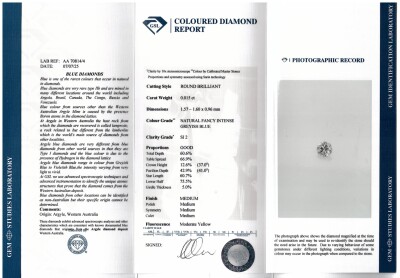 A parcel of 22 loose Natural Diamonds with 2 round Natural Argyle Origin Pink Diamond totalling 0.12ct (1 x 0.052ct with GSL Report graded as Natural Fancy Purplish Pink P1 #AA70814/3. Origin: Argyle Deposit, Western Australian) & 20 round Natural Argyle Origin Blue Diamonds totalling 0.31ct (1 x 0.015ct with GSL Report graded as Natural Fancy Intense Greyish Blue SI2 #AA70814/4. Origin: Argyle Deposit, Western Australia). (As New)