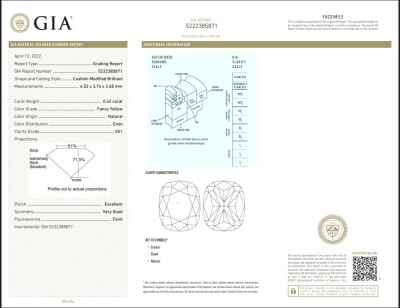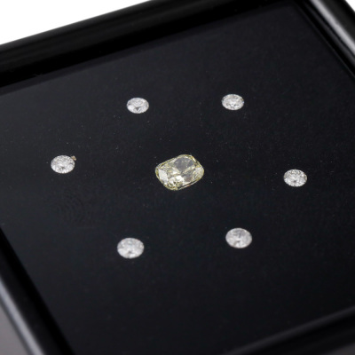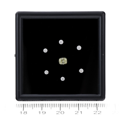 1) A loose cushion cut Natural Diamond of 0.42ct (with Copy of GIA Report graded as Natural Fancy Yellow Even VS1 #5222385871). 2) Six loose round Natural Diamonds totalling 0.27ct (Estimated grading: H-J P1).