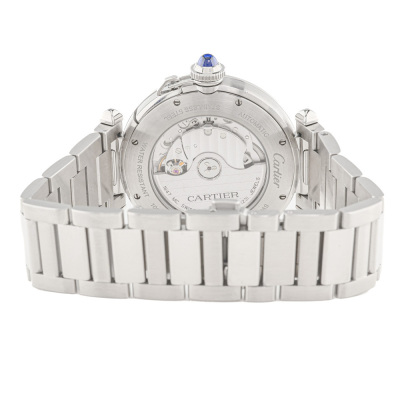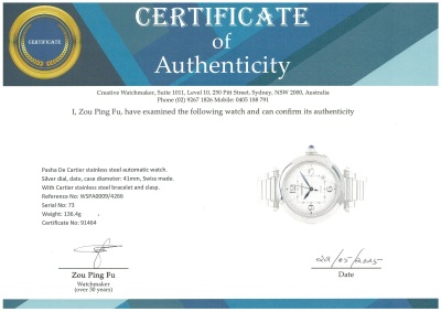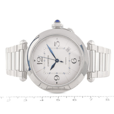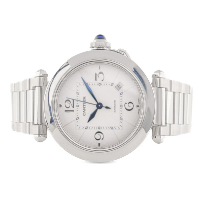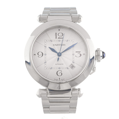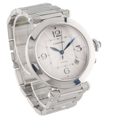 Pasha De Cartier stainless steel automatic mens watch. Silver dial, date, case diameter: 41mm, wrist size: 18cm, Swiss made. Ref# WSPA0009/4266. With Cartier stainless steel bracelet and clasp. With Certificate of Authenticity, Cartier International Warranty card dated 24/02/2022 and spare Cartier black leather strap. 3 month FSA warranty. (Pre-owned)