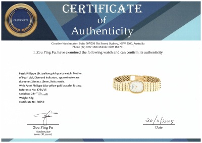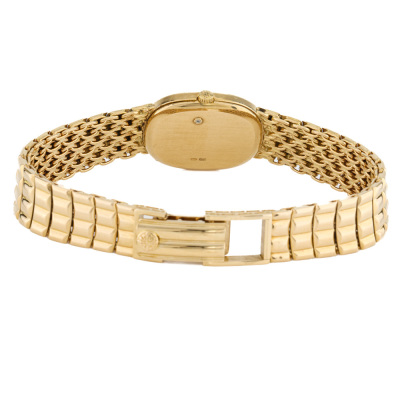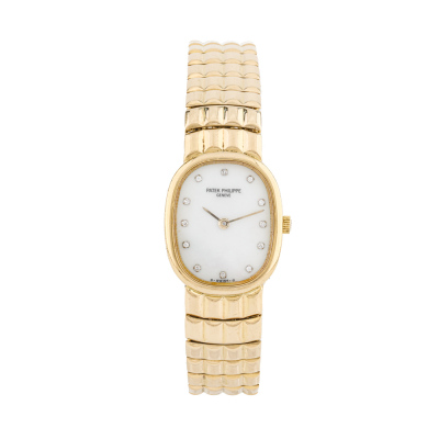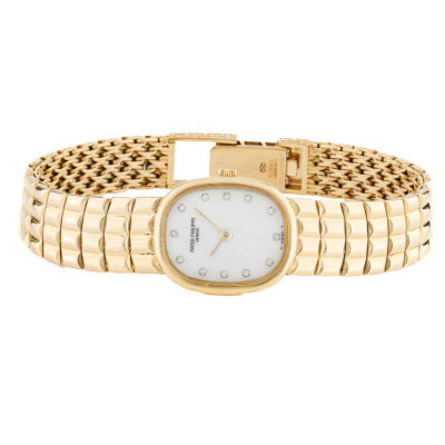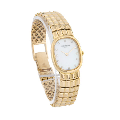 Patek Philippe Ellipse 18ct yellow gold quartz ladies watch. Mother of Pearl dial, Diamond indicators, approximate case diameter: 24mm x 19mm, max wrist size: 17.5cm, Swiss made. Ref #4764/15. Circa: 1990. With Patek Philippe 18ct yellow gold bracelet and clasp. With Certificate of Authenticity. 3 month FSA warranty. Weight: 52g (Pre-owned)