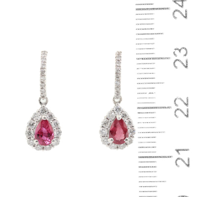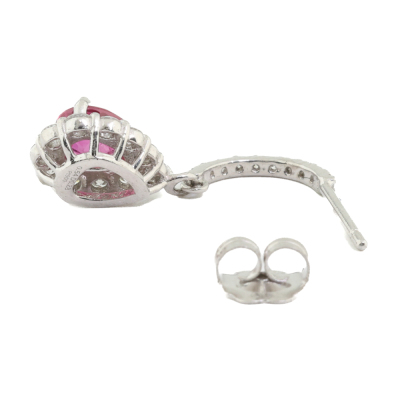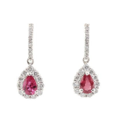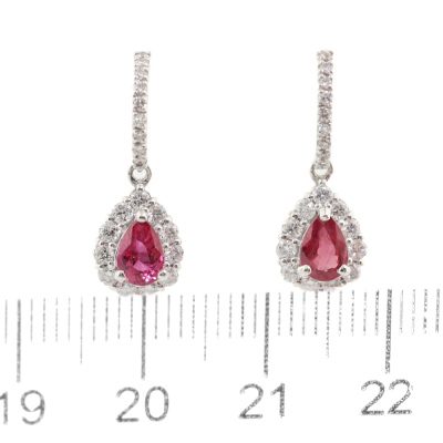Ruby and Diamond dangle earrings with pear shape Natural Rubies totalling 0.92ct and round Natural Diamonds totalling 0.56ct (Estimated grading: G-H SI). Platinum - 900 and 18ct white gold backs. Drop length: 1cm. Weight: 3.1g.