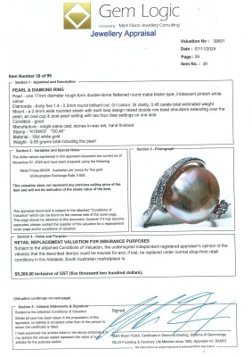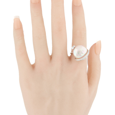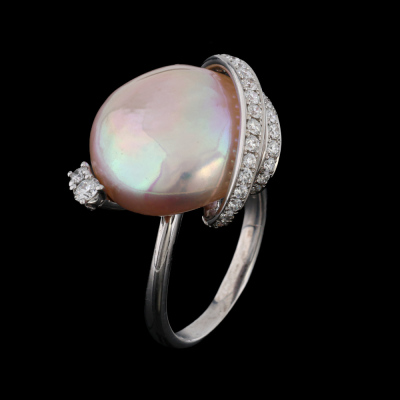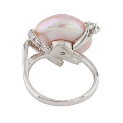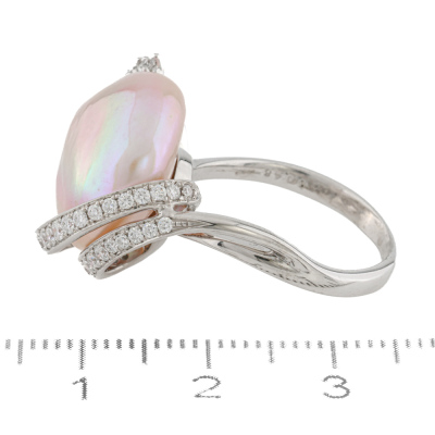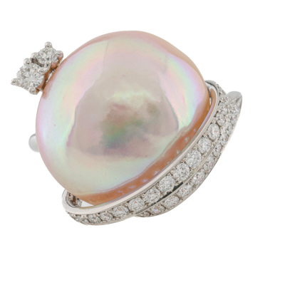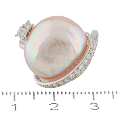 Pearl and Diamond dress ring with a Pink Cultured Pearl of 17mm and round Natural Diamonds totalling 0.48ct (Estimated grading: G-I SI). 18ct white gold. Ring size N. Band width: 2.2mm. Weight: 9.5g. With Valuation Certificate dated 07/11/2025. (Pre-owned)