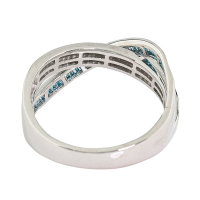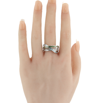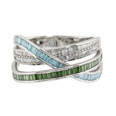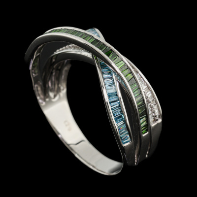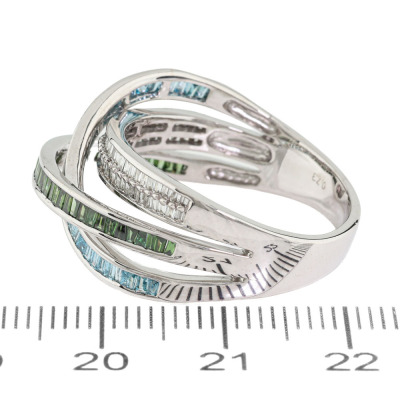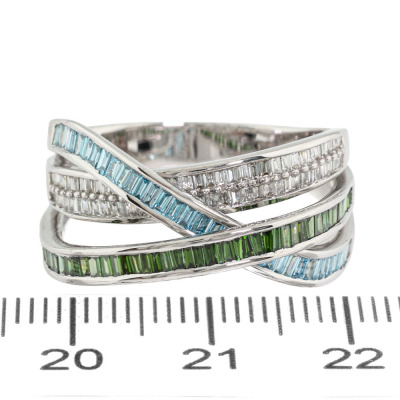 Cross over ring with baguette cut Natural Peridot totalling 0.90ct, baguette cut Natural Aquamarines totalling 0.45ct and round Natural Diamonds totalling 0.73ct (Estimated grading: H-I VS-SI). 18ct white gold. Ring size: T 3/4. Band width: 3.8mm - 5.5mm. Weight: 7.2g. (Pre-owned)