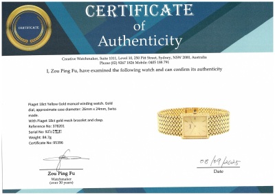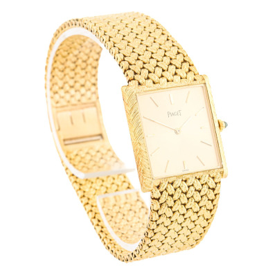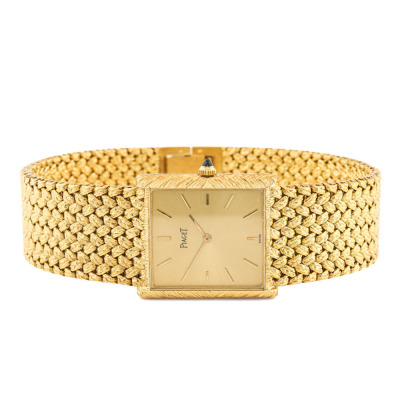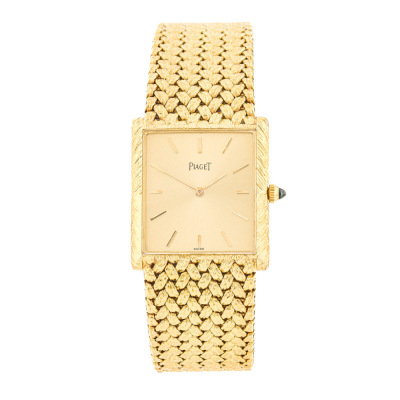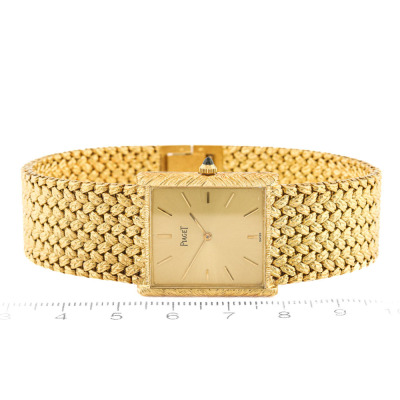 Piaget 18ct Yellow Gold manual winding ladies watch. Gold dial, approximate case diameter: 26mm x 24mm, max wrist size: 18cm, Swiss made, Ref# 378201. With Piaget 18ct gold mesh bracelet and clasp. With Certificate of Authenticity, Creative Service invoice dated 23/09/2025 and Piaget box. 6 month Creative Watchmaker warranty from the date of full service. Weight: 84.7g (Pre-owned)
