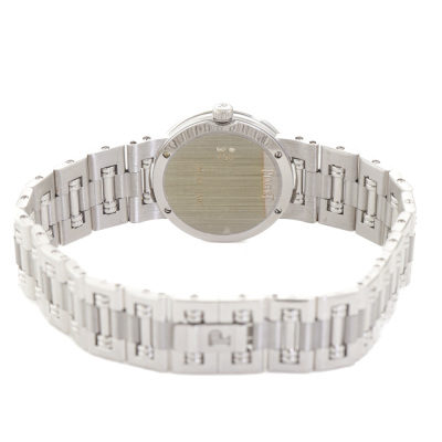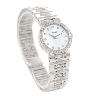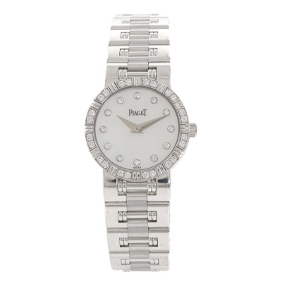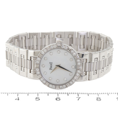 Piaget Dancer 18ct white gold quartz ladies watch. Mother of Pearl, Diamond indicators and on bezel, case diameter: 23mm, bracelet length: 17.5cm, Swiss made. Ref# 80564K81. With Piaget 18ct white gold bracelet and clasp. With Certificate of Authenticity. 3 month FSA warranty. (Pre-owned)