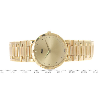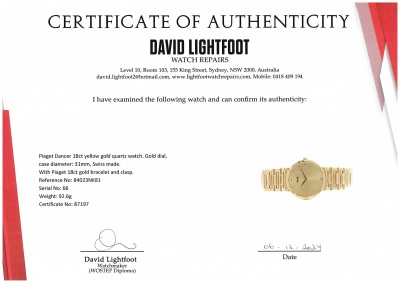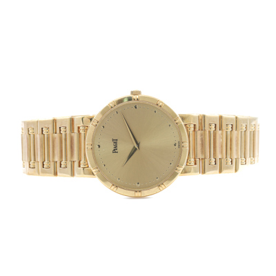 Piaget Dancer 18ct yellow gold quartz ladies watch. Gold dial, case diameter: 31mm, wrist size: 20cm, Swiss made. Ref #84023NK81. With Piaget 18ct gold bracelet and clasp. With Certificate of Authenticity, Piaget International Guarantee Certificate dated 15/07/1998 and Piaget box. 3 month FSA warranty. (Pre-owned)