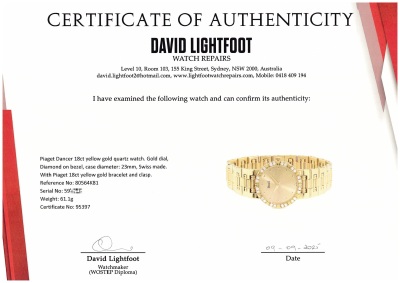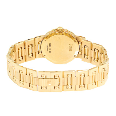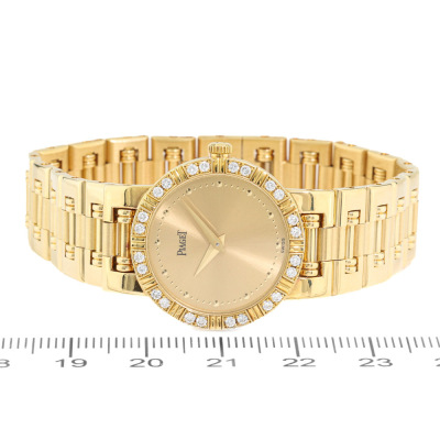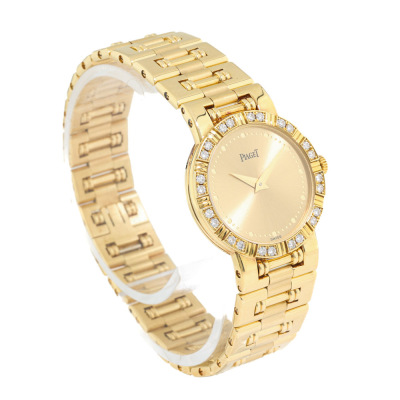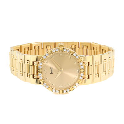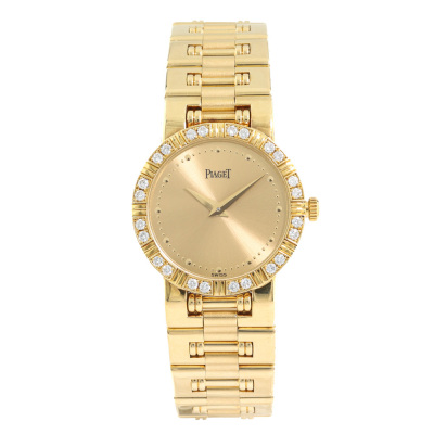 Piaget Dancer 18ct yellow gold quartz ladies watch. Gold dial, Diamond on bezel, case diameter: 23mm, max wrist size: 15cm, Swiss made. Ref# 80564K81. With Piaget 18ct yellow gold bracelet and clasp. With Certificate of Authenticity. 3 month FSA warranty. Weight: 61.1g (Pre-owned)