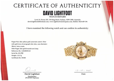Piaget Polo 18ct yellow gold automatic mens watch. Silver with gold tone chronograph dial, date, case diameter: 38mm, wrist size: 19.5cm, Swiss made. Ref# 12820M551D. With Piaget 18ct gold bracelet and clasp. With Certificate of Authenticity. 3 month FSA warranty. Weight: 213.7g (Pre-owned)