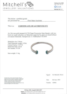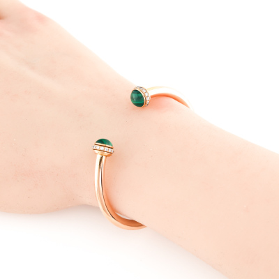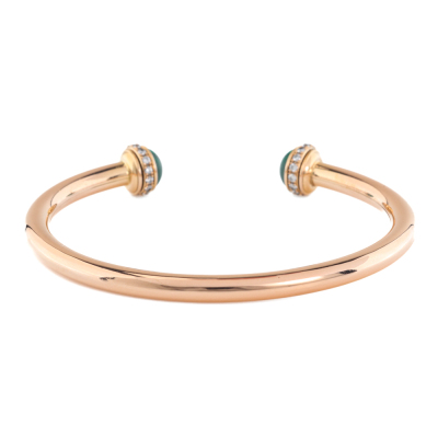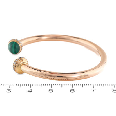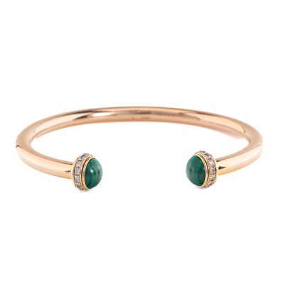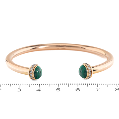 Piaget Possession Open Bangle bracelet with 2 round cabochon cut Malachite of diameter 6.9mm and round Diamonds totalling approximately 0.38ct (Estimated grading F-G VS). 18ct rose gold. Motif size width: 8.7mm. Piaget stamped size: 15. Weight: 11.4g. Certificate #420661. (Pre-owned)