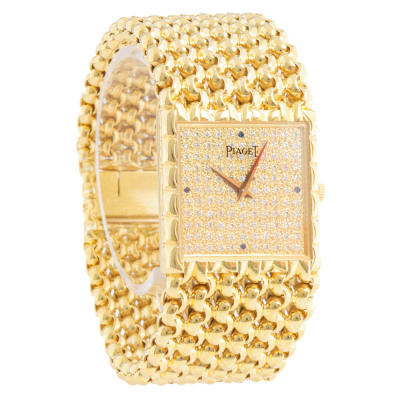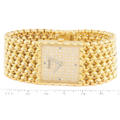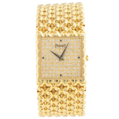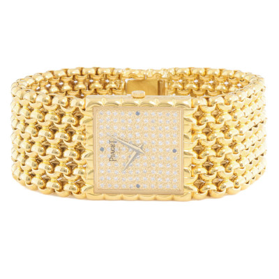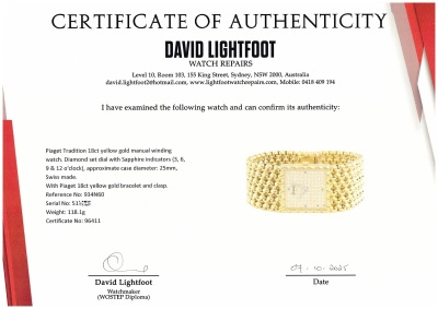 Piaget Tradition 18ct yellow gold manual winding ladies watch. Diamond set dial with Sapphire indicators (3, 6, 9 & 12 o'clock), approximate case diameter: 25mm, max wrist size: 15.5cm, Swiss made. Ref#934N60. With Piaget 18ct yellow gold bracelet and clasp. With Certificate of Authenticity. 3 month FSA warranty. Weight: 118.1g (Pre-owned)