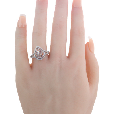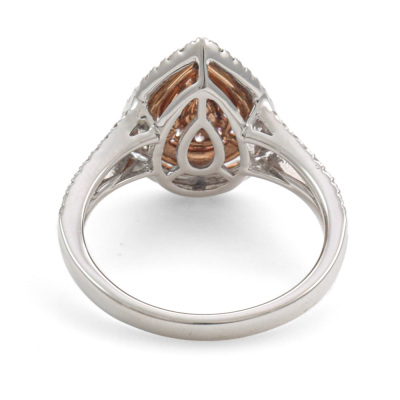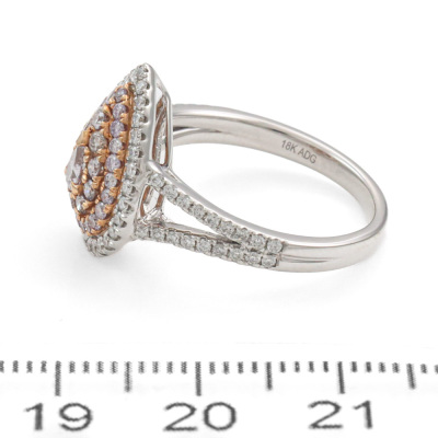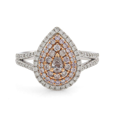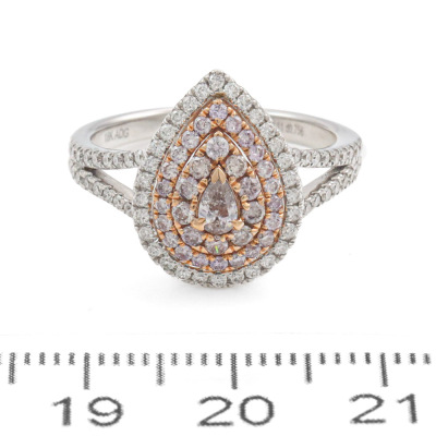 Diamond dress ring with pear shape light pink Diamond of 0.11ct and remaining round pink & white Natural Diamonds totalling 0.76ct (Estimated grading for all Diamonds: Light Pink - Pink Champagne H-I SI-P1). 18ct rose and white gold. Ring size N. Band Width: 2.1mm - 2.5mm. Weight: 4.7g. (As new)