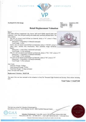 Diamond double halo ring with a centre round Natural Pink Diamond of approximately 0.22ct (Valuation Certificate graded as Fancy Pink P1) and surrounding round Natural Argyle Origin Pink Diamonds totalling 0.14ct (Valuation Certificate graded as Fancy Pink VS2-SI. Origin: Kimberley Region, West Australian) and remaining round Natural White Diamonds totalling 0.56ct (Estimated grading: F VS-SI). 18ct rose gold and platinum-950. Ring size M. Band Width: 2.8mm - 3.0mm. Weight: 8.6g. With Valuation Certificate dated 26/02/2026.
