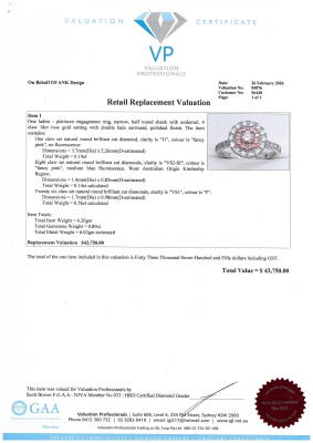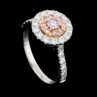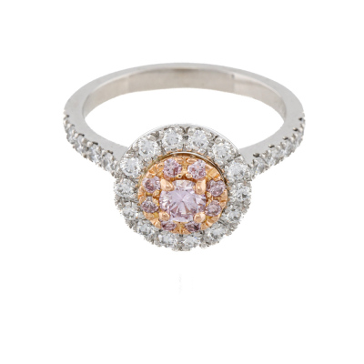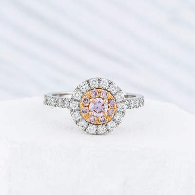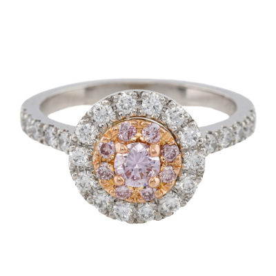 Diamond double halo ring with a centre round Natural Pink Diamond of 0.19ct (Estimated grading: Fancy Pink P1), round Argyle Origin Natural Pink Diamonds totalling 0.14ct (with Valuation Certificate graded as Fancy Pink VS-SI. Origin: Kimberley Region, Western Australian) and remaining round Natural White Diamonds totalling 0.52ct (Estimated grading: F VS). 18ct rose gold and platinum-950. Ring size M1/4. Band Width: 2mm. Weight: 6.2g. With Valuation Certificate dated 26/02/2026.