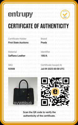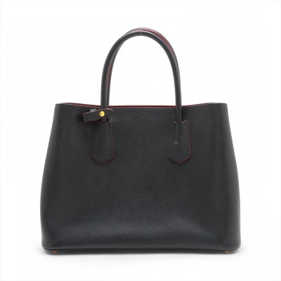 Prada Double bag in black Saffiano leather. Featuring gold-toned hardware, double top rolled handles, and expandable sides with snap buttons. The top opens to a red nappa leather interior with two compartments divided by a central pocket. Approx. dimensions: 34cm(Base-L) x 25cm(H) x 15cm(D), handle drop 13cm, adjustable & detachable strap drop 62cm. Accompanied by name tag and Prada certificate card. With Entrupy Certificate of Authenticity. (Pre-owned)