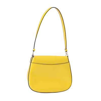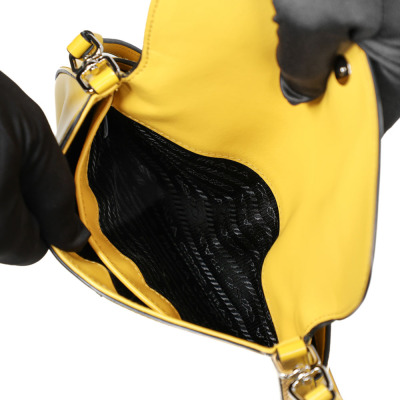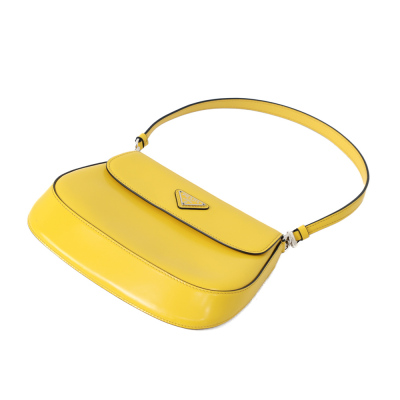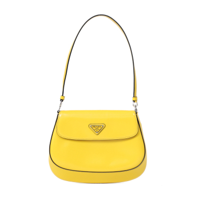 Prada Cleo flap bag in yellow glossy leather with black trims. Featuring silver-toned hardware, single shoulder height handle, a patched exterior pocket at back, and Prada logo triangle plate on front flap. The magnetic closure opens to a nylon logo printed interior with a patch pocket. Approximate dimensions: 22cm(L) x17cm(H) x 3cm(D), handle drop 21cm. Accompanied by Prada dustbag. With Entrupy Certificate of Authenticity. (Pre-owned)
