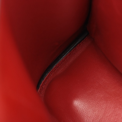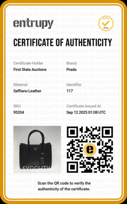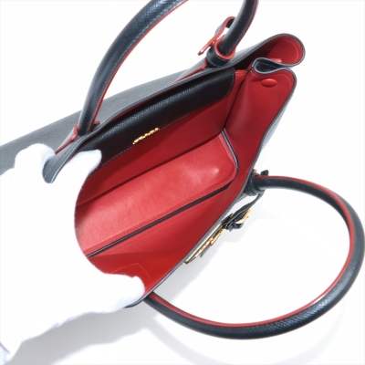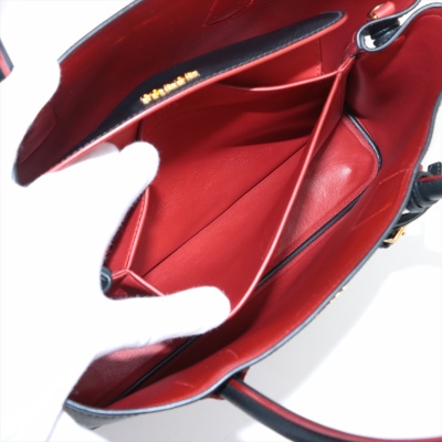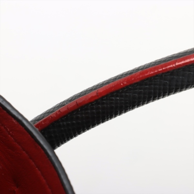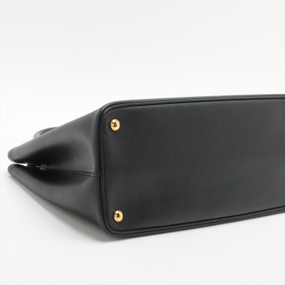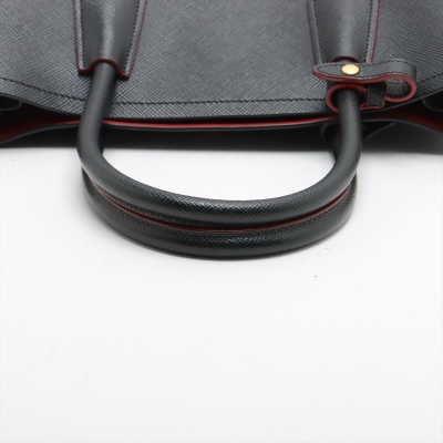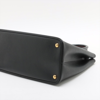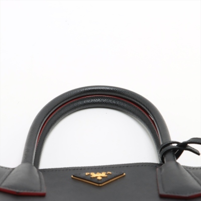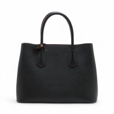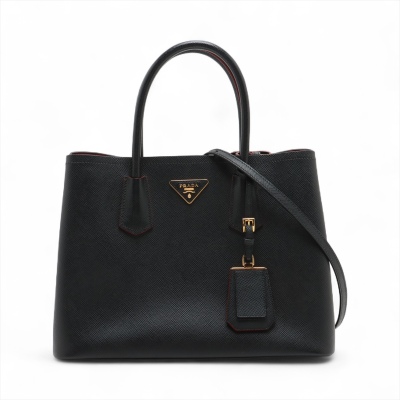 Prada double bag in black Saffiano leather. Featuring gold-toned hardware, double top rolled handles, expandable sides with snap buttons. The top opens to red nappa leather interior with two compartments divided by a central pocket. Approx. dimensions: 34cm(L) x 25cm(H) x 15cm(D), handle drop 13cm, adjustable & detachable strap drop 62cm. Accompanied by detachable name tag and handle belt. With Entrupy Certificate of Authenticity. (Pre-owned)