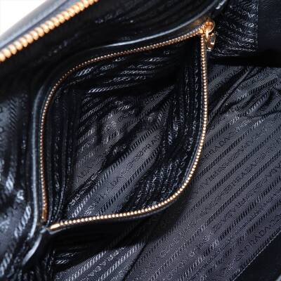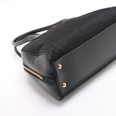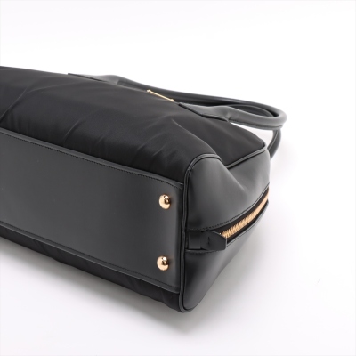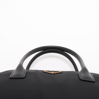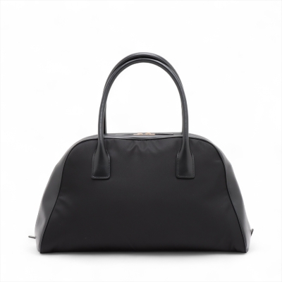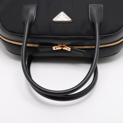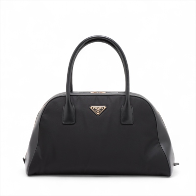Prada large top-handle bag in black padded Re-Nylon and smooth leather. Featuring gold-toned hardware, dual leather handles, logo plate at front. Two-way zipper on top opens to tonal logo-printed nylon lining interior with zipper and patched pockets. Approx dimensions: 40cm(B-L) x 22cm(H) x 14cm(D), 16cm handle drop. Accompanied by Prada dustbag. With Entrupy Certificate of Authenticity. (Pre-owned)