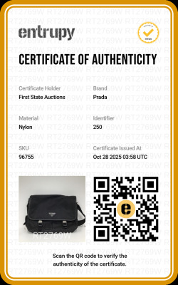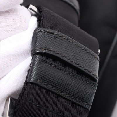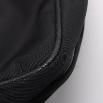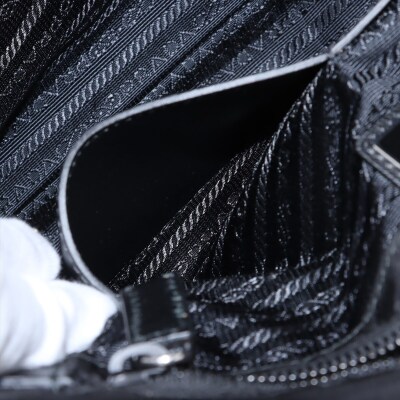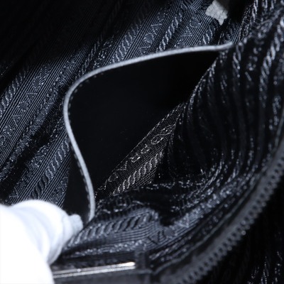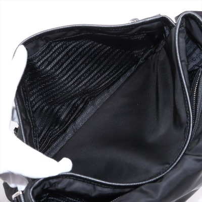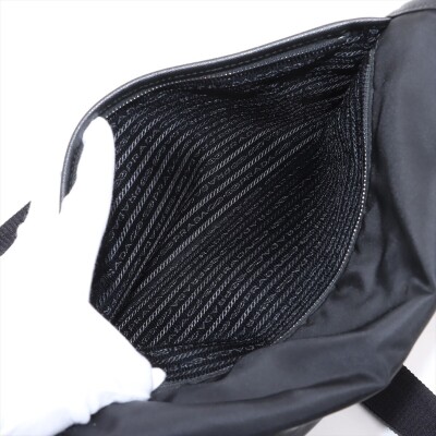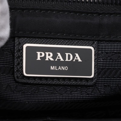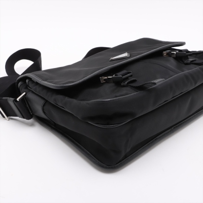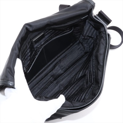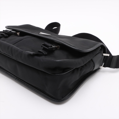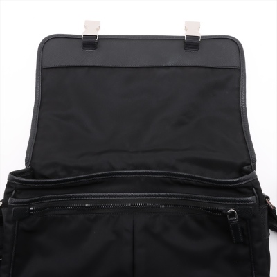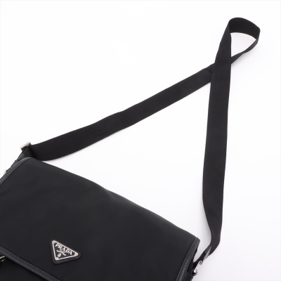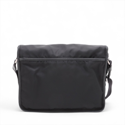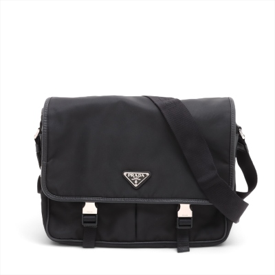 Prada logo-plate bag in black tessuto Re-nylon with saffiano leather trims. Featuring silver-tone hardware, an adjustable shoulder strap, a front flap with dual buckle fastenings, the signature triangle Prada logo plaque on the front and an exterior zip pocket at the back. The flap opens to a partitioned interior with 2 zip pockets and 2 patch pockets. Approx. dimensions: 32cm(W) x 24cm(H) x 7.5cm(D), 57cm strap drop. With Entrupy Certificate of Authenticity. (Pre-owned)