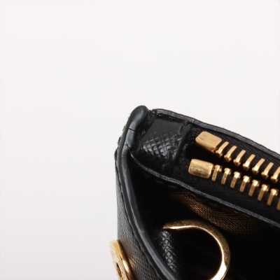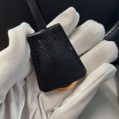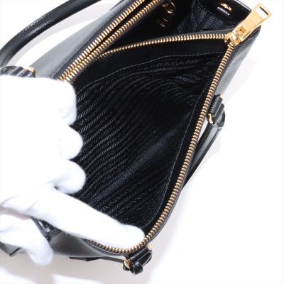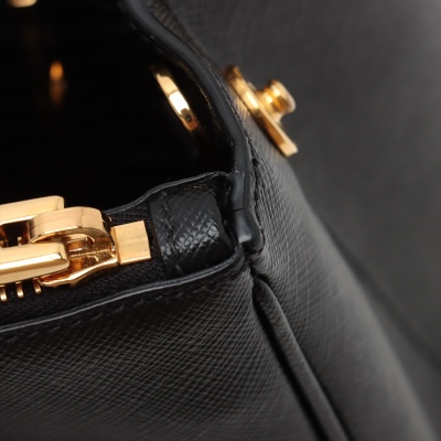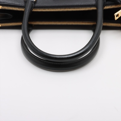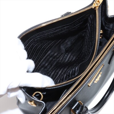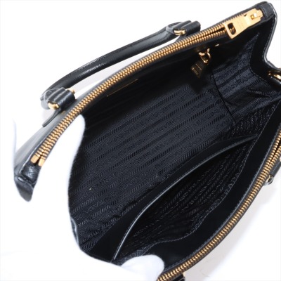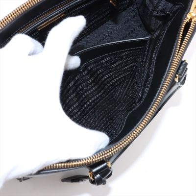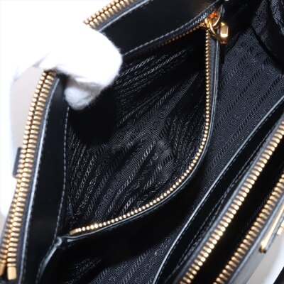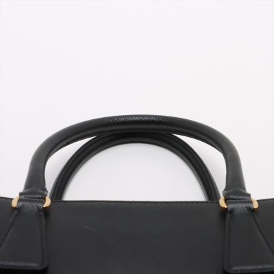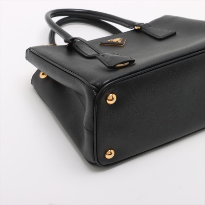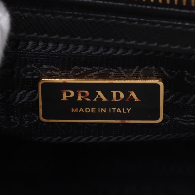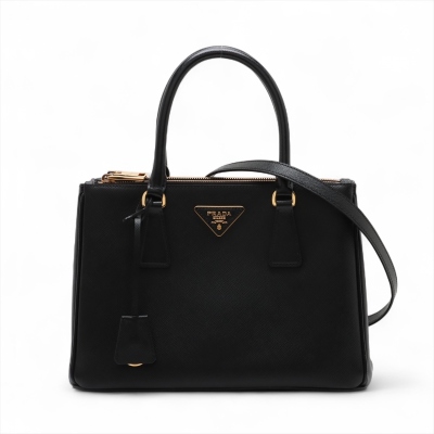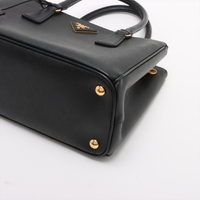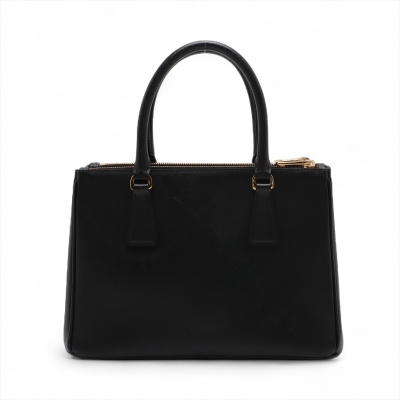 Prada medium Galleria bag in black Saffiano leather. Featuring gold-toned hardware, dual leather rolled handles, external front and back zip pockets, logo plate at front, keyring clochette, snap closures on sides. The top opens to a logo-printed nylon lining with zip & patch pockets. Approx dimensions: 29cm(B-L) x 20cm(H) x 13cm(D), handle drop 12cm, detachable strap drop 62cm, adjustable. Accompanied by Prada dustbag. With Entrupy Certificate of Authenticity. (Pre-owned)