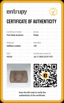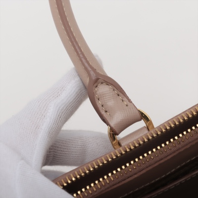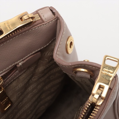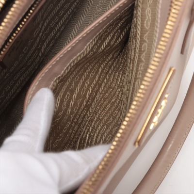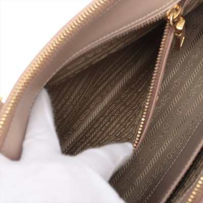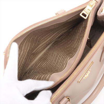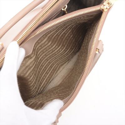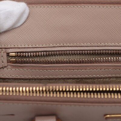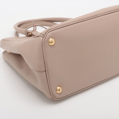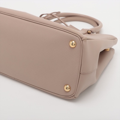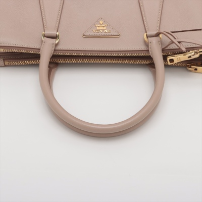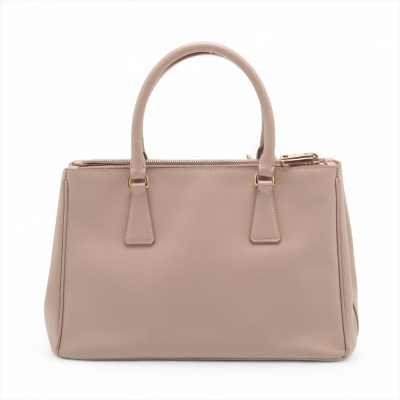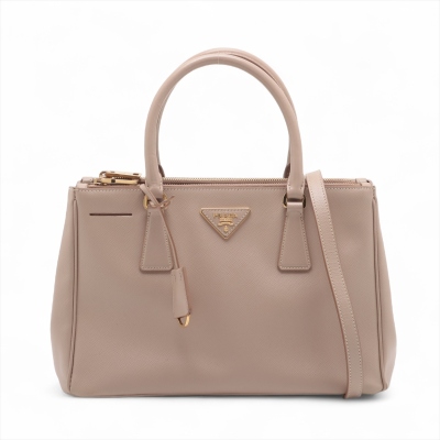 Prada medium Galleria bag in powder pink Saffiano leather. Featuring gold-toned hardware, dual leather handles, two external zipper pockets, and snap buttons on sides. The top opens to a beige logo-print nylon interior with pockets. Approximate dimensions: 30cm(Base-L) x 20cm(H) x 14cm(D), handle drop 12cm, detachable and adjustable shoulder strap 60cm. Accompanied by Prada certificate card, keyring in leather crochet. With Entrupy Certificate of Authenticity. (Pre-owned)