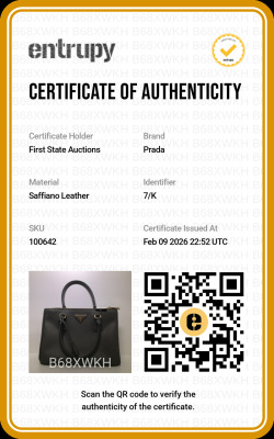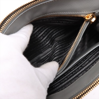 Prada medium Galleria bag in grey Saffiano leather. Featuring gold-toned hardware, dual leather handles, 2 external zipper pockets, leather with metal lettering logo at front, snap closures on sides and a detachable leather strap. The top opens to a matching grey logo jacquard nylon lined interior with zippered and patch pockets. Approximate dimensions: 28cm(base-W) x 19cm(H) x 12cm(D), with a 11.5cm handle drop and 60cm adjustable strap drop. Accompanied by a Prada leather clochette with keyring and dustbag. With Entrupy Certificate of Authenticity.